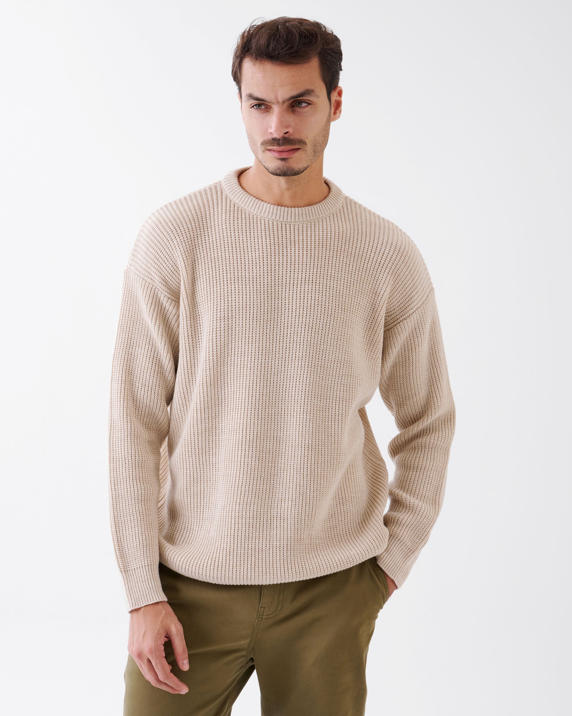 This round neck beige knitted sweater offers exceptional comfort with its soft, breathable fabric and expert craftsmanship. Its classic design ensures versatile wear, providing warmth and ease without sacrificing style. Ideal for layering or wearing alone, this sweater combines functionality and timeless appeal for everyday use.